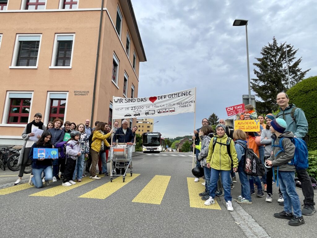 Der tödliche Unfall Anfang März 2024 ist ein tragischer Reminder, dass die kritische Verkehrssituation rund ums Schulhaus Bachmatt ungelöst ist. Als die Gemeinde dann wenige Wochen später den Busverkehr auf den bei Kindergarten- und Schulkindern beliebten Kirchweg umleitet, entscheiden wir uns zu reagieren. Mit einer kleinen, aber feinen Protestaktion setzen wir ein sichtbares Zeichen. Dafür, dass der ausufernde Verkehr nicht noch mehr Platz einnimmt – und die wenigen sicheren Strassenräume in unserer Gemeinde verschlingt. Wir fordern, dass die Kosten bzw. die daraus entstehenden Unannehmlichkeiten wie Stau etc. der Verursachende, also der motorisierten Individualverkehr (MIV), zu tragen hat. Die Bevölkerung und die Medien nehmen es gut auf – wir erhalten viel Zuspruch, dass endlich reagiert wird.