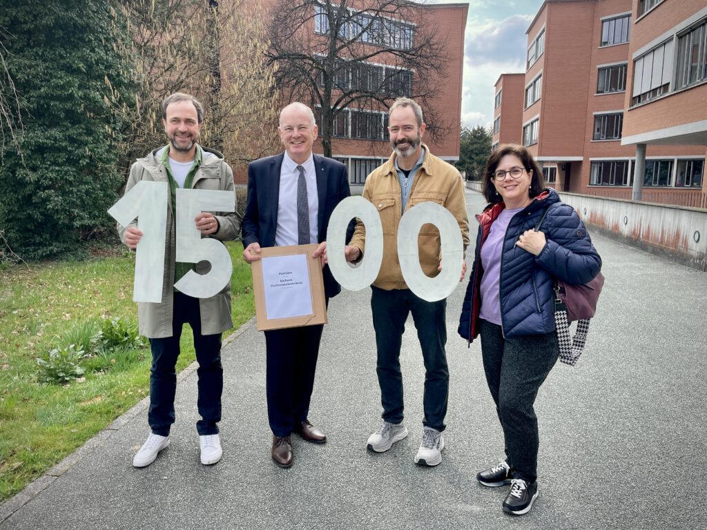 Unsere Webseite sichere-hertensteinstrasse.ch dient als Hub für die Kommunikation. Die an der Protestaktion interessierten Personen und deren Angaben dienen als Ausgangslage für unseren Newsletter. Wir setzen sowohl eine Online-Petition als auch Unterschriftsbögen auf Papier auf. Und dank der Beteiligung der Elternmitwirkung, vieler engagierter Einwohner:innen und dem Politik-Netzwerk sammeln wir innert kurzer Zeit Hunderte von Unterschriften für die Petition. Am Ende sind es knapp stolze 1’500 an der Zahl, davon allein ca. 1’100 aus unserer Gemeinde. Ein sehr starkes Zeichen, finden wir, wenn ein 8tel der Einwohnenden der Gesamtbevölkerung das Anliegen unterstützt!