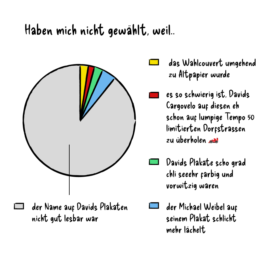 - Daher ist es mir wohl zu wenig gelungen, diese Wähler:innen zu erreichen bzw. überzeugen, welche sich grundsätzlich einen Wechsel und mehr Schwung im Gemeinderat wünschen, aber tendenziell eher konservativ wählen.